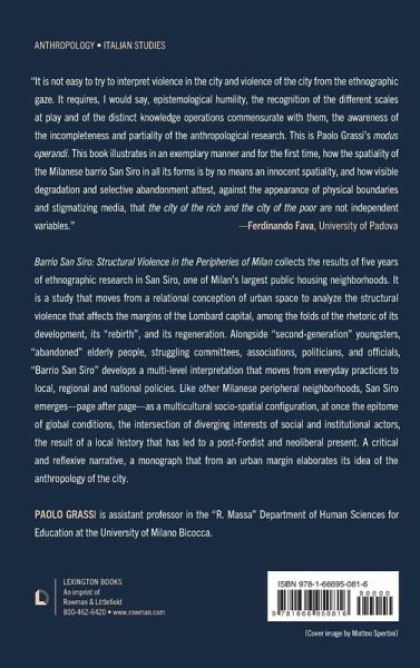 Barrio San Siro: Structural Violence in the Peripheries of Milan collects the results of five years of ethnographic research in San Siro, one of Milan’s largest public housing neighborhoods. It is a study that moves from a relational conception of urban space to analyze the structural violence that affects the margins of the Lombard capital, among the folds of the rhetoric of its development, its "rebirth", and its regeneration. Alongside "second-generation" youngsters, "abandoned" elderly people, struggling committees, associations, politicians, and officials, "Barrio San Siro" develops a multi-level interpretation that moves from everyday practices to local, regional and national policies. Like other Milanese peripheral neighborhoods, San Siro emerges – page after page – as a multicultural socio-spatial configuration, at once the epitome of global conditions, the intersection of diverging interests of social and institutional actors, the result of a local history that has led to a post-Fordist and neoliberal present. A critical and reflexive narrative, a monograph that from an urban margin elaborates its idea of the anthropology of the city.