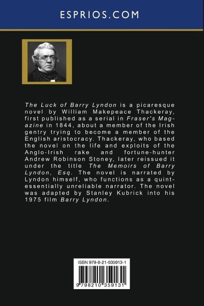 The Luck of Barry Lyndon is a picaresque novel by William Makepeace Thackeray, first published as a serial in Fraser's Magazine in 1844, about a member of the Irish gentry trying to become a member of the English aristocracy. Thackeray, who based the novel on the life and exploits of the Anglo-Irish rake and fortune-hunter Andrew Robinson Stoney, later reissued it under the title The Memoirs of Barry Lyndon, Esq. The novel is narrated by Lyndon himself, who functions as a quintessentially unreliable narrator. The novel was adapted by Stanley Kubrick into his 1975 film Barry Lyndon.