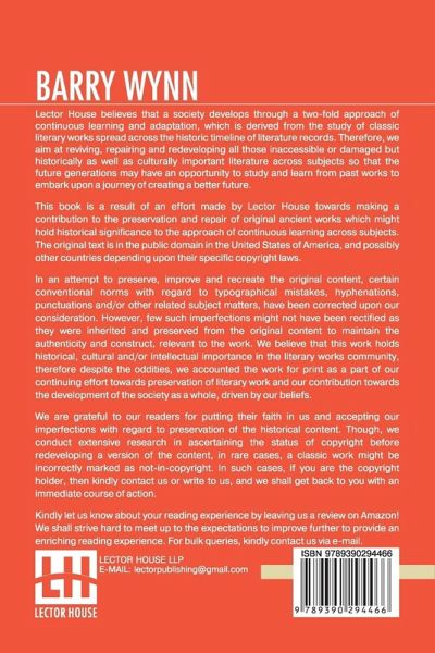 Barry Wynn: Or The Adventures Of A Page Boy In The United States Congress This book is a result of an effort made by us towards making a contribution to the preservation and repair of original classic literature. In an attempt to preserve, improve and recreate the original content, we have worked towards: 1. Type-setting & Reformatting: The complete work has been re-designed via professional layout, formatting and type-setting tools to re-create the same edition with rich typography, graphics, high quality images, and table elements, giving our readers the feel of holding a 'fresh and newly' reprinted and/or revised edition, as opposed to other scanned & printed (Optical Character Recognition - OCR) reproductions. 2. Correction of imperfections: As the work was re-created from the scratch, therefore, it was vetted to rectify certain conventional norms with regard to typographical mistakes, hyphenations, punctuations, blurred images, missing content/pages, and/or other related subject matters, upon our consideration. Every attempt was made to rectify the imperfections related to omitted constructs in the original edition via other references. However, a few of such imperfections which could not be rectified due to intentional\unintentional omission of content in the original edition, were inherited and preserved from the original work to maintain the authenticity and construct, relevant to the work. We believe that this work holds historical, cultural and/or intellectual importance in the literary works community, therefore despite the oddities, we accounted the work for print as a part of our continuing effort towards preservation of literary work and our contribution towards the development of the society as a whole, driven by our beliefs. We are grateful to our readers for putting their faith in us and accepting our imperfections with regard to preservation of the historical content. HAPPY READING!