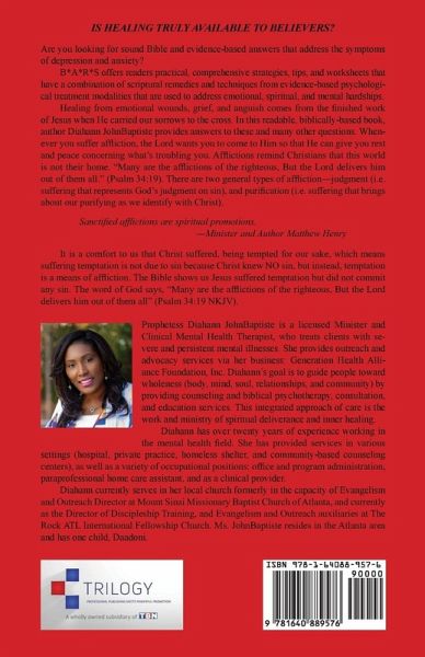 IS HEALING TRULY AVAILABLE TO BELIEVERS? Are you looking for sound Bible and evidence-based answers that address the symptoms of depression and anxiety? B*A*R*S offers readers practical, comprehensive strategies, tips, and worksheets that have a combination of scriptural remedies and techniques from evidence-based psychological treatment modalities that are used to address emotional, spiritual, and mental hardships. Healing from emotional wounds, grief, and anguish comes from the finished work of Jesus when He carried our sorrows to the cross. In this readable, biblically-based book, author Diahann JohnBaptiste provides answers to these and many other questions. Whenever you suffer affliction, the Lord wants you to come to Him so that He can give you rest and peace concerning what’s troubling you. Afflictions remind Christians that this world is not their home. "Many are the afflictions of the righteous, But the Lord delivers him out of them all." (Psalm 34:19). There are two general types of affliction—judgment (i.e. suffering that represents God’s judgment on sin), and purification (i.e. suffering that brings about our purifying as we identify with Christ). Sanctified afflictions are spiritual promotions. —Minister and Author Matthew Henry It is a comfort to us that Christ suffered, being tempted for our sake, which means suffering temptation is not due to sin because Christ knew NO sin, but instead, temptation is a means of affliction. The Bible shows us Jesus suffered temptation but did not commit any sin. The word of God says, "Many are the afflictions of the righteous, But the Lord delivers him out of them all" (Psalm 34:19 NKJV).