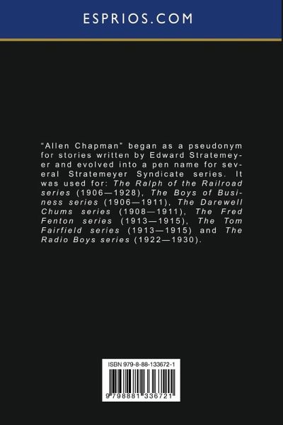 "Allen Chapman" began as a pseudonym for stories written by Edward Stratemeyer and evolved into a pen name for several Stratemeyer Syndicate series. It was used for: The Ralph of the Railroad series (1906-1928), The Boys of Business series (1906-1911), The Darewell Chums series (1908-1911), The Fred Fenton series (1913-1915), The Tom Fairfield series (1913-1915) and The Radio Boys series (1922-1930).