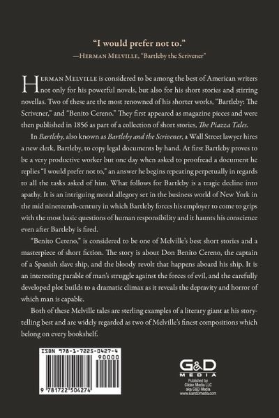 "I would prefer not to." - Herman Melville, "Bartleby the Scrivener" Herman Melville is considered to be among the best of American writers not only for his powerful novels, but also for his short stories and stirring novellas. Two of these are the most renowned of his shorter works, Bartleby: The Scrivener, and Benito Cereno. They first appeared as magazine pieces and were then published in 1856 as part of a collection of short stories, The Piazza Tales. In Bartleby, also known as Bartleby and the Scrivener, a Wall Street lawyer hires a new clere, Bartleby, to copy legal documents by hand. At first Bartleby proves to be a very productive worker but one day when asked to proofread a document he replies "I would prefer not to", an answer he begins repeating perpetually in regards to all the tasks asked of him. What follows for Bartleby is a tragic decline into apathy. It is an intriguing moral allegory set in the business world of New York in the mid 19th-century in which Bartleby forces his employer to come to grips with the most basic questions of human responsibility and it haunts his conscience even after Bartleby is fired. Benito Cereno, is considered to be one of Melville's best short stories and a masterpiece of short fiction. The story is about Don Benito Cereno, the captain of a Spanish slave ship, and the bloody revolt that happens aboard his ship. It is an interesting parable of man's struggle against the forces of evil, and the carefully developed plot builds to a dramatic climax as it reveals the depravity and horror of which man is capable. Both of these Melville tales are sterling examples of a literary giant at his story-telling best and are widely regarded as two of Melville's finest compositions which belong on every bookshelf.