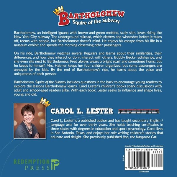 Bartholomew, an intelligent iguana with brown-and-green mottled, scaly skin, loves riding the New York City subway. The underground railroad, which clatters and whooshes before it takes off, teems with people, but Bartholomew doesn't mind. He enjoys his escape from his life in a museum exhibit and spends the morning observing other passengers. On his ride, Bartholomew watches several Regulars and learns about their similarities, their differences, and how they interact or don't interact with others. Bubbly Becky radiates joy, and she even sits next to Bartholomew. Fred always wears a bright scarf and sometimes hums, but he keeps to himself. Mrs. Hatmer keeps her four children organized, but some passengers are annoyed by the kids. By the end of Bartholomew's ride, he learns about the value and uniqueness of each person. Bartholomew, Squire of the Subway includes questions in the back to encourage young readers to explore the lessons Bartholomew learns. Carol Lester's children's books spark discussions with adult and school-aged readers alike. With each book, Lester seeks to influence and shape lives, young and old.