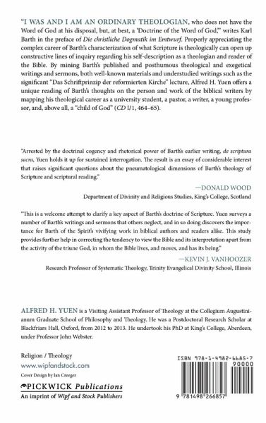 Description: ""I was and I am an ordinary theologian, who does not have the Word of God at his disposal, but, at best, a 'Doctrine of the Word of God,'"" writes Karl Barth in the preface of Die christliche Dogmatik im Emtwurf. Properly appreciating the complex career of Barth's characterization of what Scripture is theologically can open up constructive lines of inquiry regarding his self-description as a theologian and reader of the Bible. By mining Barth's published and posthumous theological and exegetical writings and sermons, both well-known materials and understudied writings such as the significant ""Das Schriftprinzip der reformierten Kirche"" lecture, Alfred H. Yuen offers a unique reading of Barth's thoughts on the person and work of the biblical writers by mapping his theological career as a university student, a pastor, a writer, a young professor, and, above all, a ""child of God"" (CD I/1, 464-65).