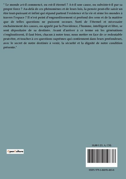 " Le monde a-t-il commencé, ou est-il éternel ? A-t-il une cause, ou subsiste-t-il par sa propre force ? Au-delà de ces phénomènes et de leurs lois, la pensée peut-elle saisir un être tout-puissant et infini qui répand partout l¿existence et la vie et sème les mondes à travers l¿espace ? Il n¿est point d¿engourdissement si profond des sens et de la matière que de telles questions ne puissent secouer. Sorti de l¿éternel et nécessaire enchaînement des causes, ou appelé par la Providence, l¿homme, intelligent et libre, se sent dépositaire de sa destinée. Avant d¿arriver à ce terme où les générations s¿engloutissent, il faut bien, chacun à notre tour, nous mettre en face de ce redoutable peut-être, et toucher à ces questions suprêmes qui contiennent dans leurs profondeurs, avec le secret de notre destinée à venir, la sécurité et la dignité de notre condition présente."