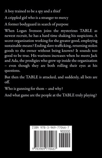 A boy trained to be a spy and a thief A crippled girl who is a stranger to mercy A former bodyguard in search of purpose When Logan Svenson joins the mysterious TABLE as newest recruit, he has a hard time shaking his suspicions. A secret organization working for the greater good, employing sustainable means? Ending slave trafficking, returning stolen goods to the owner without being known? It sounds too good to be true. His wariness increases when he meets Jack and Ada, the prodigies who grew up inside the organization - even though they are both rolling their eyes at his questions. But then the TABLE is attacked, and suddenly, all bets are off. Who is gunning for them - and why? And what game are the people at the TABLE truly playing?