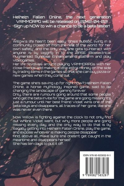Helheim Fallen Online, the next generation VRMMORPG will be released on 2042-04-02! Sign up NOW to win a chance to be a beta tester! Willow’s life hasn’t been easy. She’s autistic, living in a community closed off from the rest of the world ‘for her own safety’, and the only way she gets to interact with anyone is by logging in to the BASE (Bioelectrical Augmented Synapse Enhancement) platform and play videogames. Her life revolves around playing VRMMORPGs with her close friends and making a little extra money on the side by trading items in the games so that she can buy pizza or new games when they come out. The game she’s saving up for right now? Helheim Fallen Online, a Norse mythology inspired game, said to be changing the landscape of gaming forever. Only, there are rumours going around that some people who get the beta invite for the game are going missing. It’s just a rumour, until her best friend Violet wins one of the beta keys and disappears, all traces of her gone, like she was never even there. Now Willow is fighting against the clock to not only find out where Violet went, but why more people are going missing every day, and the only way to do that is by illegally getting into Helheim Fallen Online, play the game, and expose whoever is making people disappear. And, above all, make sure she doesn’t get caught in the meantime and disappears herself. She has ten days to pull it off.