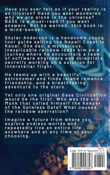BASE: The Edge of Reality Imagine a future from where you explore endless worlds and repeatedly live an entire life anywhere and at any time of your choosing. Skyler Anderson is a handsome young tour guide sailing the Napali Coast in Kauai. One day, a mysterious, inexplicable rainbow leads him on a journey where he encounters a team of software engineers and scientists secretly working on a solution for interstellar flight. He teams up with a beautiful astronomer and finds island romance, friendship, and a breathtaking adventure to the stars. ¿¿¿¿Yet only one original Civilization was the first. To visit the Base Civilization is to go where it all began.