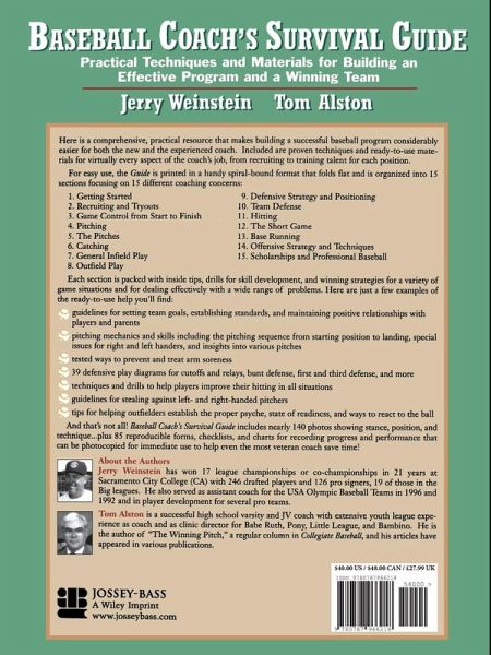 Jerry Weinstein has won 15 league championships or co-championships in 19 years at Sacramento City college (CA) with 232 drafted players and 119 pro signers, 15 of those in the Big leagues. He also serves as assistant coach for the USA Baseball Teams in 1996 and 192 and as a scout for several pro ball teams. Tom Alston is a successful high school varsity and JV coach with extensive youth league experience as a coach and as clinic director for Babe Ruth, Pony, Little League, and Bambino. He is the author of Winning Pitch, a regular column in Collegiate Baseball, and his articles have appeared in various publications.