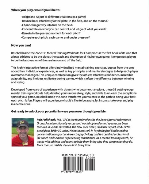 Get ready to unlock your potential in ways you never thought possible! Baseball Inside the Zone: 33 Mental Training Workouts for Champions is the first book of its kind that allows the athlete to be the player, the coach and the champion of his/her game. It empowers players to be the best version of themselves on and off the field. This highly interactive format offers individualized mental training exercises, quotes from the pros about their individual experiences, as well as key principles and mental strategies to help each player overcome challenges. This unique combination gives the athlete effortless confidence, incredible adaptability, and limitless resilience during games, resilience, which is often the difference between winning and losing. Developed from years of experience with players who became champions, these 33 cutting edge mental training workouts help develop your unique story, style, and skills to unleash the exceptional spirit of your game. Baseball Inside the Zone transforms your talents so the path to being your best each pitch is fun. Players will experience what is like to be aware, let instincts take over and play inside the zone.