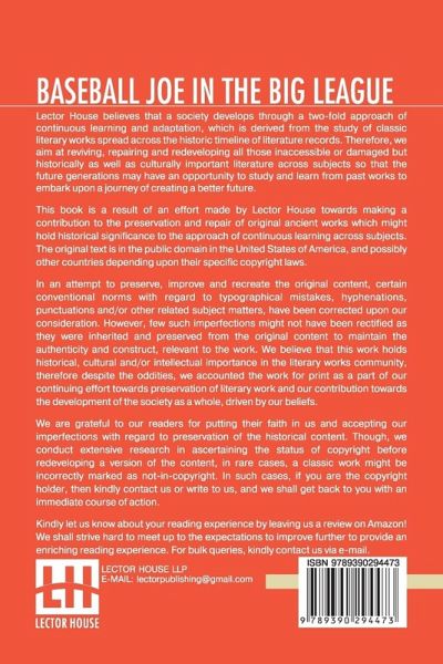 Baseball Joe In The Big League: Or A Young Pitcher's Hardest Struggles This book is a result of an effort made by us towards making a contribution to the preservation and repair of original classic literature. In an attempt to preserve, improve and recreate the original content, we have worked towards: 1. Type-setting & Reformatting: The complete work has been re-designed via professional layout, formatting and type-setting tools to re-create the same edition with rich typography, graphics, high quality images, and table elements, giving our readers the feel of holding a 'fresh and newly' reprinted and/or revised edition, as opposed to other scanned & printed (Optical Character Recognition - OCR) reproductions. 2. Correction of imperfections: As the work was re-created from the scratch, therefore, it was vetted to rectify certain conventional norms with regard to typographical mistakes, hyphenations, punctuations, blurred images, missing content/pages, and/or other related subject matters, upon our consideration. Every attempt was made to rectify the imperfections related to omitted constructs in the original edition via other references. However, a few of such imperfections which could not be rectified due to intentional\unintentional omission of content in the original edition, were inherited and preserved from the original work to maintain the authenticity and construct, relevant to the work. We believe that this work holds historical, cultural and/or intellectual importance in the literary works community, therefore despite the oddities, we accounted the work for print as a part of our continuing effort towards preservation of literary work and our contribution towards the development of the society as a whole, driven by our beliefs. We are grateful to our readers for putting their faith in us and accepting our imperfections with regard to preservation of the historical content. HAPPY READING!