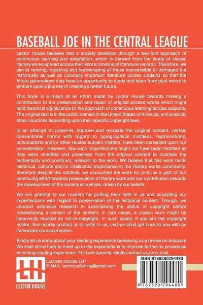 Baseball Joe In The Central League: Or Making Good As A Professional Pitcher This book is a result of an effort made by us towards making a contribution to the preservation and repair of original classic literature. In an attempt to preserve, improve and recreate the original content, we have worked towards: 1. Type-setting & Reformatting: The complete work has been re-designed via professional layout, formatting and type-setting tools to re-create the same edition with rich typography, graphics, high quality images, and table elements, giving our readers the feel of holding a 'fresh and newly' reprinted and/or revised edition, as opposed to other scanned & printed (Optical Character Recognition - OCR) reproductions. 2. Correction of imperfections: As the work was re-created from the scratch, therefore, it was vetted to rectify certain conventional norms with regard to typographical mistakes, hyphenations, punctuations, blurred images, missing content/pages, and/or other related subject matters, upon our consideration. Every attempt was made to rectify the imperfections related to omitted constructs in the original edition via other references. However, a few of such imperfections which could not be rectified due to intentional\unintentional omission of content in the original edition, were inherited and preserved from the original work to maintain the authenticity and construct, relevant to the work. We believe that this work holds historical, cultural and/or intellectual importance in the literary works community, therefore despite the oddities, we accounted the work for print as a part of our continuing effort towards preservation of literary work and our contribution towards the development of the society as a whole, driven by our beliefs. We are grateful to our readers for putting their faith in us and accepting our imperfections with regard to preservation of the historical content. HAPPY READING!