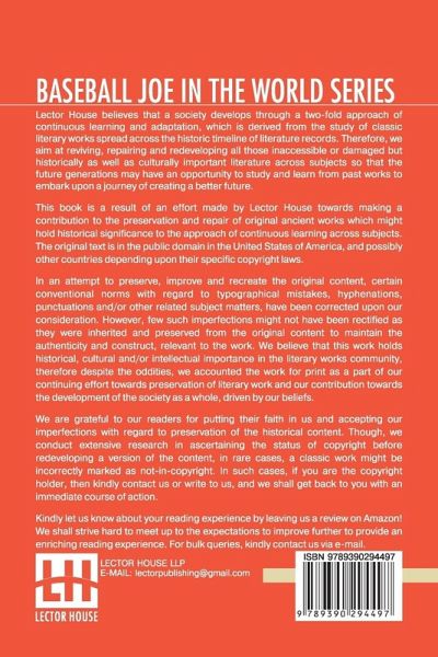 Baseball Joe In The World Series: Or Pitching For The Championship This book is a result of an effort made by us towards making a contribution to the preservation and repair of original classic literature. In an attempt to preserve, improve and recreate the original content, we have worked towards: 1. Type-setting & Reformatting: The complete work has been re-designed via professional layout, formatting and type-setting tools to re-create the same edition with rich typography, graphics, high quality images, and table elements, giving our readers the feel of holding a 'fresh and newly' reprinted and/or revised edition, as opposed to other scanned & printed (Optical Character Recognition - OCR) reproductions. 2. Correction of imperfections: As the work was re-created from the scratch, therefore, it was vetted to rectify certain conventional norms with regard to typographical mistakes, hyphenations, punctuations, blurred images, missing content/pages, and/or other related subject matters, upon our consideration. Every attempt was made to rectify the imperfections related to omitted constructs in the original edition via other references. However, a few of such imperfections which could not be rectified due to intentional\unintentional omission of content in the original edition, were inherited and preserved from the original work to maintain the authenticity and construct, relevant to the work. We believe that this work holds historical, cultural and/or intellectual importance in the literary works community, therefore despite the oddities, we accounted the work for print as a part of our continuing effort towards preservation of literary work and our contribution towards the development of the society as a whole, driven by our beliefs. We are grateful to our readers for putting their faith in us and accepting our imperfections with regard to preservation of the historical content. HAPPY READING!