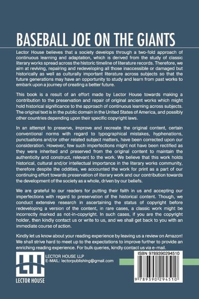 Baseball Joe On The Giants: Or Making Good As A Ball Twirler In The Metropolis This book is a result of an effort made by us towards making a contribution to the preservation and repair of original classic literature. In an attempt to preserve, improve and recreate the original content, we have worked towards: 1. Type-setting & Reformatting: The complete work has been re-designed via professional layout, formatting and type-setting tools to re-create the same edition with rich typography, graphics, high quality images, and table elements, giving our readers the feel of holding a 'fresh and newly' reprinted and/or revised edition, as opposed to other scanned & printed (Optical Character Recognition - OCR) reproductions. 2. Correction of imperfections: As the work was re-created from the scratch, therefore, it was vetted to rectify certain conventional norms with regard to typographical mistakes, hyphenations, punctuations, blurred images, missing content/pages, and/or other related subject matters, upon our consideration. Every attempt was made to rectify the imperfections related to omitted constructs in the original edition via other references. However, a few of such imperfections which could not be rectified due to intentional\unintentional omission of content in the original edition, were inherited and preserved from the original work to maintain the authenticity and construct, relevant to the work. We believe that this work holds historical, cultural and/or intellectual importance in the literary works community, therefore despite the oddities, we accounted the work for print as a part of our continuing effort towards preservation of literary work and our contribution towards the development of the society as a whole, driven by our beliefs. We are grateful to our readers for putting their faith in us and accepting our imperfections with regard to preservation of the historical content. HAPPY READING!