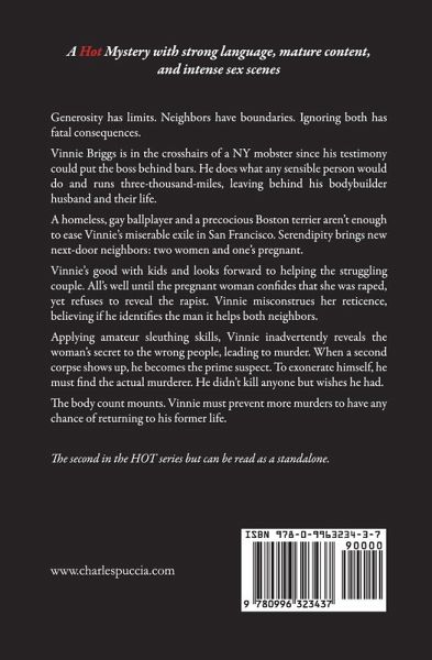 A Hot Mystery with strong language, mature content, and intense sex scenes. Generosity has limits. Neighbors have boundaries. Ignoring both has fatal consequences. Vinnie Briggs is in the crosshairs of a NY mobster since his testimony could put the boss behind bars. He does what any sensible person would do and runs three-thousand-miles, leaving behind his bodybuilder husband and their life. A homeless, gay ballplayer and a precocious Boston terrier aren't enough to ease Vinnie's miserable exile in San Francisco. Serendipity brings new next-door neighbors: two women and one's pregnant. Vinnie's good with kids and looks forward to helping the struggling couple. All's well until the pregnant woman confides that she was raped, yet refuses to reveal the rapist. Vinnie misconstrues her reticence, believing if he identifies the man it helps both neighbors. Applying amateur sleuthing skills, Vinnie inadvertently reveals the woman's secret to the wrong people, leading to murder. When a second corpse shows up, he becomes the prime suspect. To exonerate himself, he must find the actual murderer. He didn't kill anyone but wishes he had. The body count mounts. Vinnie must prevent more murders to have any chance of returning to his former life. The second in the HOT series but can be read as a standalone.