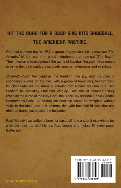 Hit the road for a deep dive into baseball, the American pastime. On a hot summer day in 1987, a group of guys who call themselves "The Amoeba" hit the road in a rented motor home that they call "The Bago." Their mission was to experience the game of baseball the way it was meant to be, in the great outdoors on lovely summer afternoons and evenings. Baseball Road Trip captures the freedom, the joy, and the pain of spending six days on the road with a group of fun-loving, beer-drinking knuckleheads. As the Amoeba crawls from Royals stadium to Busch Stadium to Comiskey Park and Wrigley Field, bits of baseball history creep in; the curse of the Billy goat, the black sox scandal, Eddie Gaedel, Sportsman's Park. Of course, no road trip would be complete without visits to the local bars and taverns, rich with baseball history, that can often be found just outside the ballparks. You will enjoy this book if you are a fan of baseball and/or road trips with friends. Fun, laughs and history fill every page. Batter up!