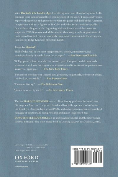 With Baseball: The Golden Age, Dr. Harold Seymour--the man whom Sports Illustrated has called 'the Edward gibbon of baseball history'--continues his monumental multi-volume study of the sport. This second volume explores the both glorious and grievous era when the game truly captured the American imagination with such legendary figures at Ty Cobb and Babe Ruth and also appalled fans with startling scandals. Beginning with the formation of the two major leagues in 1903, Seymour examines the changes in the organization of professional baseball from an unwieldy three-man commission to the strong one-man rule of Judge Kenesaw Mountain Landis.