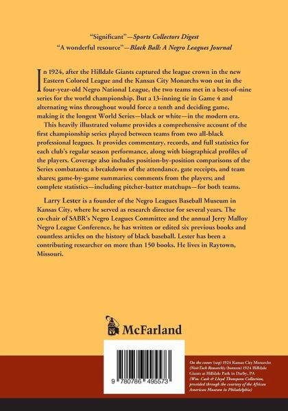 In 1924, after the Hilldale Giants captured the league crown in the new Eastern Colored League and the Kansas City Monarchs won out in the four-year-old Negro National League, the two teams met in a best-of-nine series for the world championship. But a 13-inning tie in Game 4 and alternating wins throughout would force a tenth and deciding game, making it the longest World Series--black or white--in the modern era. This heavily illustrated volume provides a comprehensive account of the first championship series played between teams from two all-black professional leagues. It provides commentary, records, and full statistics for each club's regular season performance, along with biographical profiles of the players. Coverage also includes position-by-position comparisons of the Series combatants; a breakdown of the attendance, gate receipts, and team shares; game-by-game summaries; comments from the players; and complete statistics--including pitcher-batter matchups--for both teams.