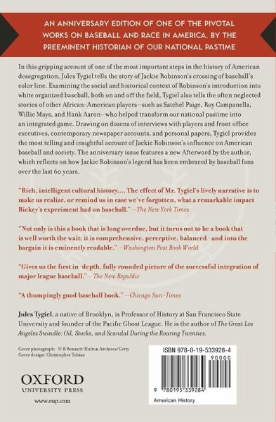 In this gripping account of one of the most important steps in the history of American desegregation, Jules Tygiel tells the story of Jackie Robinson's crossing of baseball's color line. Examining the social and historical context of Robinson's introduction into white organized baseball, both on and off the field, Tygiel also tells the often neglected stories of other African-American players--such as Satchel Paige, Roy Campanella, Willie Mays, and Hank Aaron--who helped transform our national pastime into an integrated game. Drawing on dozens of interviews with players and front office executives, contemporary newspaper accounts, and personal papers, Tygiel provides the most telling and insightful account of Jackie Robinson's influence on American baseball and society. The anniversary issue features a new foreword by the author.