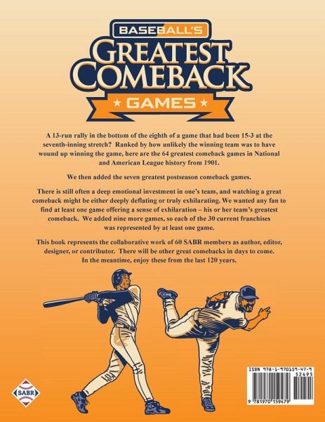 What are Major League Baseball's greatest comeback games? This book set out to collect the stories of those games, but rather than throw together an anecdotally-determined collection of games, SABR decided to see if there was an objective measure, a way to determine which was the greatest comeback game of all time, and to rank the games. Retrosheet's Tom Ruane created a master list of 630 games and ranked them mathematically in terms of how unlikely the win was, and therefore how great the comeback had been. The games in this volume are presented in rank order, from number 1 through 64. We also added the greatest postseason comeback games. These seven contests are presented in a separate section devoted to postseason games. And to make sure that every current team in MLB was represented in this volume, we treated the Los Angeles Dodgers and San Francisco Giants as different from the Brooklyn Dodgers and New York Giants, and added the greatest comeback by the Colorado Rockies, Texas Rangers, and several other teams. In the end, every major-league team in represented in Baseball's Greatest Comeback Games, but the Phillies lead the list with six comeback wins in the top 64. Tied for second for most comebacks are four American League teams: the Red Sox, Indians, Tigers, and Yankees. This book was a team effort by 60 members of the Society for American Baseball Research, who researched and wrote about all 80 games presented herein.