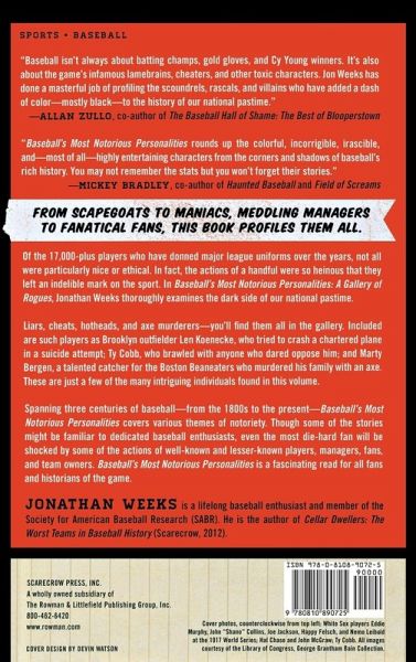 Of the 17,000-plus players who have donned major league uniforms over the years, not all were particularly nice or ethical. In fact, the actions of a handful were so heinous, they left an indelible mark on the sport. In Baseball’s Most Notorious Personalities: A Gallery of Rogues, Jonathan Weeks thoroughly examines this dark side of our National Pastime. Liars, cheats, hotheads, even axe murderers—you’ll find them all here in the Gallery. From scapegoats to maniacs, meddling managers to fanatical fans, this book profiles them all. Included are players such as Brooklyn outfielder Len Koenecke, who tried to crash a chartered plane in a maniacal suicide attempt; Ty Cobb, who was known to slide into bases with spikes flying and brawl with anyone who dared oppose him, including an attack on a fan who heckled him from the stands; and Marty Bergen, a talented catcher for the Boston Beaneaters who murdered his family with an axe. These are just a few of the many intriguing individuals found in this volume. Spanning three centuries of baseball—from the 1800s into the current decade—Baseball’s Most Notorious Personalities covers various themes of notoriety. Though some of the stories may be familiar to the dedicated baseball enthusiast, even the most die-hard fan will be shocked and surprised by some of the actions of well-known and lesser-known players, managers, fans, and team owners contained in this book. Baseball’s Most Notorious Personalities is a fascinating read for all baseball fans and historians.