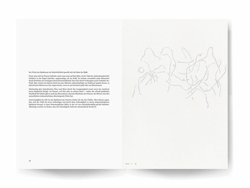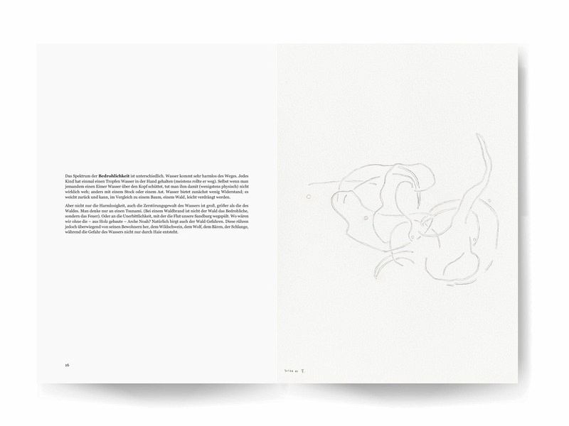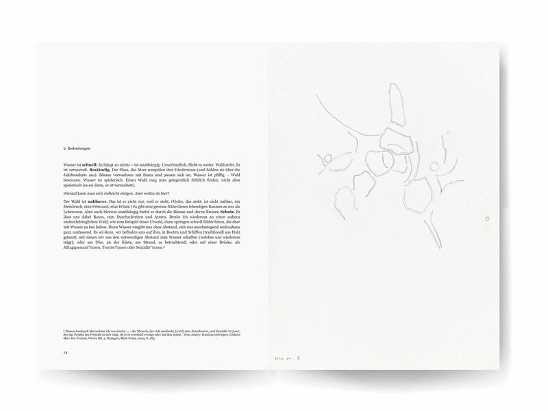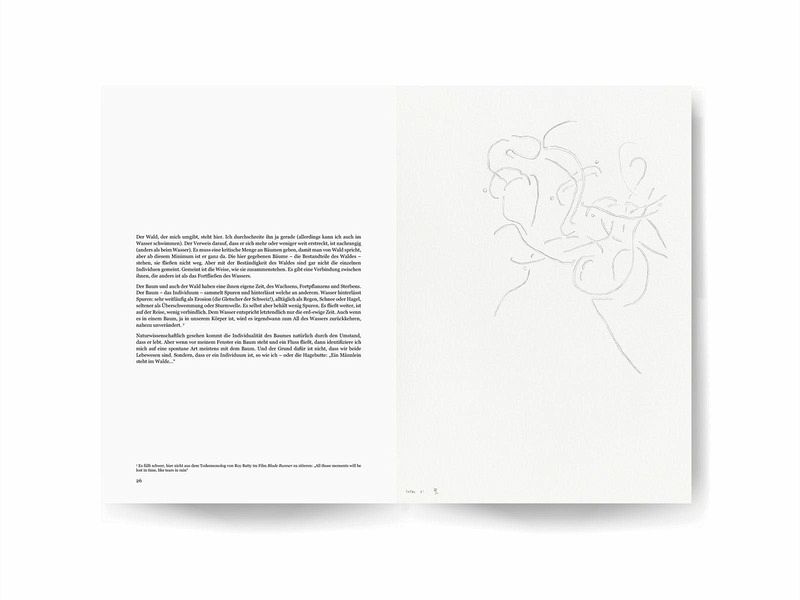 Mit "Basel" geht Boris Ferreira in 25 Zeichnungen der Frage nach, welche Bedeutung Wasser und Wald für unsere Identität haben. Die 25 im Maßstab 1:1 abgebildete Zeichnungen von Boris Ferreira entstammen einer Serie, die während einer halbjährigen Künstlerresidenz in der Stiftung Bartels Fondation in Basel 2023/2024 entstanden sind. In vorangegangenen Zyklen gab es im gezeichneten Raum wenige Figuren, die der Blick der Betrachtenden zu Konstellationen verbinden musste. In Basel hat Boris Ferreira nun diese möglichen Verbindungen selbst gezeichnet - die Figuren hingegen sind verschwunden. Als Ausdrucksmittel für diese Nachverfolgung hat Boris Ferreira in dieser Serie die Doppellinie gefunden, die manchmal eher geknetet als gezogen anmutet. In seinem Essay spürt der Philosoph und Künstler, der in Lissabon aufwuchs und seit knapp zehn Jahren am Fuß des Schwarzwaldes lebt, den Bedeutungssphären von Wasser und Wald nach. Sie werden gegenübergestellt, unter Einsatz von Begriffen wie Schnelligkeit, Beständigkeit, Nahbarkeit, Schutz, Bedrohlichkeit, Fortsetzung, Wachstum und Belang, sowie den Begriffen totum analyticum und totum syntheticum von Kant. Es werden Aspekte unseres Bildes von uns selbst herausgestellt, die wir auf Wasser und Wald projizieren. Final wird die Frage verfolgt, inwiefern umgekehrt Wasser und Wald Unzulänglichkeiten unseres Bildes unserer Identität hervorheben lassen.