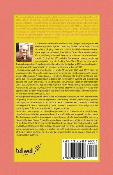 Fr. John Boos was born in Trinidad in 1937, began studying law there after his high school years, continuing further studies later on in the UK. After qualifying there as a solicitor, but before being admitted to the legal bar, he joined the Catholic Order of the Missionaries of Africa, studying in Ireland, England and France. He was ordained priest in Trinidad in 1970, and after five years of primary missionary evangelization work in Burkina Faso, West Africa, he returned to Trinidad on vacation. There he received his admission to the bar in 1975, and on his return to Africa was later upgraded, in his absence, to attorney-at-law in 1987.His missionary work continued on his return to Africa, from 1975 until 1992, when he was appointed to Mexico to assist in promoting missionary vocations among the young people of both sexes. A needed year of rest followed his return to the UK in 2000, and from 2002-2004 he was engaged again in promotion work, both in Burkina and in adjoining Togo to the south of Burkina. He was then sent to Canada as vocation promoter from 2004-2007, when he was appointed to Algeria in North Africa. Family obligations caused his return to Canada in 2008, where he remained after their cessation. He was then appointed to assist in the parishes of the Toronto and Durham regions of Ontario, which he has been doing to this year, 2023.Although not being a parish priest of the Archdiocese of Toronto, Fr. John has continued his priestly vocation of celebrating Mass in over twenty parishes, performing baptisms, marriages, and funerals-both in the churches and in retirement homes-counselling, visiting parishioners at home, giving the occasional conference to assorted groups, like the Knights of Columbus, the Women's League, youth, etc.He has also been engaged in putting his experiences and observations into print through his reflections of fifty-four years of ordained life, and to this date has produced three books. The first was on world history, seen through the eyes of a fantasy beast (The Unicorn, a historical fantasy, Friesen Press). The second concerns snippets of his missionary life (Into Africa, Tellwell Publishing), and the third is about his reflections on the world and Catholic life (Basement Priest, Tellwell Publishing). This fifth is similar to the preceding, being unabashedly catechetic and apologetic, both qualities seen as necessary because of the pervading endemic need of clarity concerning the good news of Jesus and its importance in our lives.