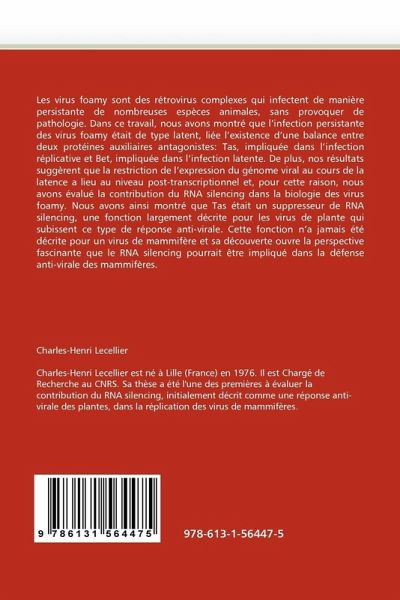 Les virus foamy sont des rétrovirus complexes qui infectent de manière persistante de nombreuses espèces animales, sans provoquer de pathologie. Dans ce travail, nous avons montré que l'infection persistante des virus foamy était de type latent, liée l'existence d'une balance entre deux protéines auxiliaires antagonistes: Tas, impliquée dans l'infection réplicative et Bet, impliquée dans l'infection latente. De plus, nos résultats suggèrent que la restriction de l'expression du génome viral au cours de la latence a lieu au niveau post-transcriptionnel et, pour cette raison, nous avons évalué la contribution du RNA silencing dans la biologie des virus foamy. Nous avons ainsi montré que Tas était un suppresseur de RNA silencing, une fonction largement décrite pour les virus de plante qui subissent ce type de réponse anti-virale. Cette fonction n'a jamais été décrite pour un virus de mammifère et sa découverte ouvre la perspective fascinante que le RNA silencing pourrait être impliqué dans la défense anti-virale des mammifères.