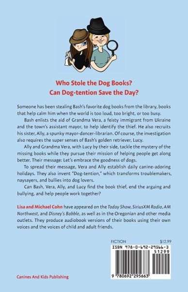Who Stole the Dog Books? Can Dog-tention Save the Day? Someone has been stealing Bash's favorite dog books from the library, books that help calm him when the world is too loud, too bright, or too busy. Bash enlists the aid of Grandma Vera, a feisty immigrant from Ukraine and the town's assistant mayor, to help identify the thief. He also recruits his sister, Ally, a spunky mayor-dancer-librarian. Of course, the investigation also requires the super senses of Bash's golden retriever, Lucy. Ally and Grandma Vera, with Lucy by their side, tackle the mystery of the missing books while they pursue their mission of helping people get along better. Their message: Let's embrace the goodness of dogs. To spread their message, Vera and Ally establish daily canine-adoring holidays. They also invent "Dog-tention," which transforms troublemakers, naysayers, and bullies into dog lovers. Can Bash, Vera, Ally, and Lucy find the book thief, end the arguing and bullying, and help people work together? Written by Lisa Cohn (Mom) and Michael Cohn (age 14), award-winning authors who have appeared on the Today Show, AM Northwest, in Disney's Babble, the Oregonian and other media outlets.