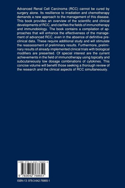 Advanced Renal Cell Carcinoma (RCC) cannot be cured bysurgery alone. Its resillience to irradiation andchemotherapy demands a new approach to the management ofthis disease.This bookprovides an overview of the scientific and clinicaldevelopments of RCC,and clarifies the fields ofimmunotherapy andimmunobiology.The book contains a compilation of approaches that willenhance the effectiveness of the management of advancedRCC,even in the absence of definitive pre-clinical data. Theserequire additional study and will stimulate the reassessmentof preliminary results.Furthermore, preliminary resultsof already implemented clinical trials withbiologicalmodifiers are presented. Of special interest are the currentachievements in thefield of immunotherapy using topically and subcutaneouslylow dosage combinations of cytokines.This concise volumewill benefit those seeking a thorough review of the researchand the clinical aspects of RCC simultaneously.