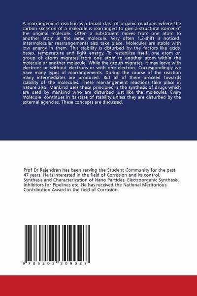 A rearrangement reaction is a broad class of organic reactions where the carbon skeleton of a molecule is rearranged to give a structural isomer of the original molecule. Often a substituent moves from one atom to another atom in the same molecule. Very often 1,2-shift is noticed. Intermolecular rearrangements also take place. Molecules are stable with low energy in them. This stability is disturbed by the factors like acids, bases, temperature and light energy. To restabilize itself, one atom or group of atoms migrates from one atom to another atom within the molecule or another molecule. While the group migrates, it may leave with electrons or without electrons or with one electron. Correspondingly we have many types of rearrangements. During the course of the reaction many intermediates are produced. But all of them proceed towards stability of the molecules. These rearrangement reactions take place in nature also. Mankind uses these principles in the synthesis of drugs which are used by mankind who are disturbed just like the molecules. Every molecule continues in its state of stability unless they are disturbed by the external agencies. These concepts are discussed.