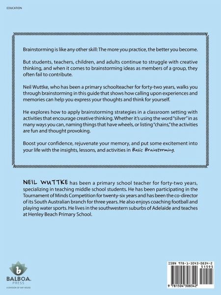 Brainstorming is like any other skill: The more you practice, the better you become. But students, teachers, children, and adults continue to struggle with creative thinking, and when it comes to brainstorming ideas as members of a group, they often fail to contribute. Neil Wuttke, who has been a primary schoolteacher for forty-two years, walks you through brainstorming in this guide that shows how calling upon experiences and memories can help you express your thoughts and think for yourself. He explores how to apply brainstorming strategies in a classroom setting with activities that encourage creative thinking. Whether it’s using the word "silver" in as many ways you can, naming things that have wheels, or listing "chains," the activities are fun and thought provoking. Boost your confidence, rejuvenate your memory, and put some excitement into your life with the insights, lessons, and activities in Basic Brainstorming.