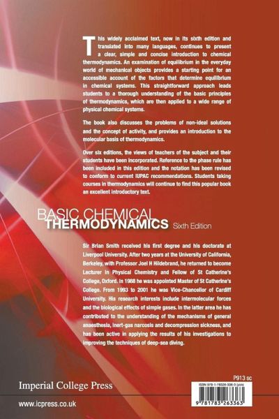 This widely acclaimed text, now in its sixth edition and translated into many languages, continues to present a clear, simple and concise introduction to chemical thermodynamics. An examination of equilibrium in the everyday world of mechanical objects provides a starting point for an accessible account of the factors that determine equilibrium in chemical systems. This straightforward approach leads students to a thorough understanding of the basic principles of thermodynamics, which are then applied to a wide range of physical chemical systems. The book also discusses the problems of non-ideal solutions and the concept of activity, and provides an introduction to the molecular basis of thermodynamics. Over six editions, the views of teachers of the subject and their students have been incorporated. Reference to the phase rule has been included in this edition and the notation has been revised to conform to current IUPAC recommendations. Students taking courses in thermodynamics will continue to find this popular book an excellent introductory text.