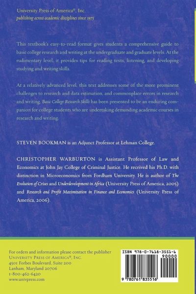 This textbook's easy-to-read format gives students a comprehensive guide to basic college research and writing at the undergraduate and graduate levels. At the rudimentary level, it provides tips for reading texts; listening; and developing studying and writing skills.
