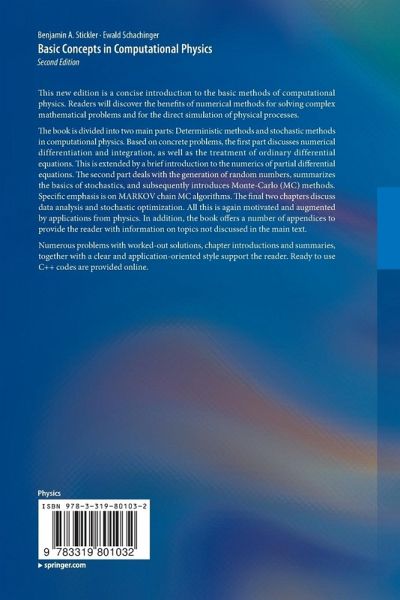 The book is divided into two main parts: Deterministic methods and stochastic methods in computational physics. Based on concrete problems, the first part discusses numerical differentiation and integration, as well as the treatment of ordinary differential equations. This is extended by a brief introduction to the numerics of partial differential equations. The second part deals with the generation of random numbers, summarizes the basics of stochastics, and subsequently introduces Monte-Carlo (MC) methods. Specific emphasis is on MARKOV chain MC algorithms. The final two chapters discuss data analysis and stochastic optimization. All this is again motivated and augmented by applications from physics. Inaddition, the book offers anumber of appendices to provide the reader with information on topics not discussed in the main text.