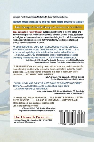 Gain confidence and creativity in your family therapy interventions with new, up-to-date research!Basic Concepts in Family Therapy: An Introductory Text, Second Edition, presents twenty-two basic psychological concepts that therapists may use to understand clients and provide successful services to them. Each chapter focuses on a single concept using material from family therapy literature, basic psychological and clinical research studies, and cross-cultural research studies. Basic Concepts in Family Therapy is particularly useful to therapists working in a family context with child- or adolescent-referred problems, and for students and clinicians treating the problems they see every day in their community. The book builds on the strengths of the first edition, incorporating ideas and articles that have become worthy of investigating since 1990 into the original text. This new edition also introduces five new chapters on resiliency and poverty, adoption, chronic illness, spirituality and religion, and parenting strategies. The new chapters make the book far more relevant for students and clinicians try ing to use family theory and technique in response to the problems they see in their communities. Basic Concepts in Family Therapy will assist you in offering clients better services by providing a deeper understanding of the contemporary family in its various forms, the psychological bonds that shape all families, and the developmental stages of the family life cycle. This exploration of how family demography, stages and life cycles affect family functions is a solid foundation from which all of the therapeutic concepts in this book can be explored. Some of the facets of family therapy you will explore in Basic Concepts in Family Therapy are: the importance of spirituality and religion in family therapy generational boundaries, closeness, and role behaviors managing a family's emotions defining problems and generating and evaluating possible solutions teaching children specific attitudes, values, social skills, and norms transracial adoptions and normative processes and developmental issues of adoptive parents strategies for reducing conflict . . . and much more!Basic Concepts in Family Therapy will help to broaden your understanding of the ways families function in general. You can use the effective concepts explored in this text to make a thorough assessment of the impact of a disorder on a child and on the rest of his or her family, as well as how family dynamics might have shaped or exacerbated the problems. The concepts described in this text can be customized to clients'cultural values to avoid unnecessary resistance. As a new therapist, you will gain confidence in your assessments, and if you are already a seasoned professional, you will gain creativity in your interventions.