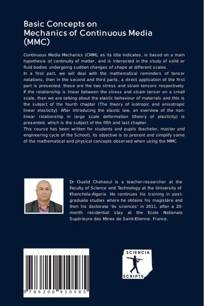Continuous Media Mechanics (CMM), as its title indicates, is based on a main hypothesis of continuity of matter, and is interested in the study of solid or fluid bodies undergoing sudden changes of shape at different scales.In a first part, we will deal with the mathematical reminders of tensor notations, then in the second and third parts, a direct application of the first part is presented, these are the two stress and strain tensors respectively. If the relationship is linear between the stress and strain tensor on a small scale, then we are talking about the elastic behaviour of materials and this is the subject of the fourth chapter (The theory of isotropic and anisotropic linear elasticity). After introducing the elastic law, an overview of the non-linear relationship in large scale deformation (theory of plasticity) is presented, which is the subject of the fifth and last chapter.This course has been written for students and pupils (bachelor, master and engineering cycle of the School), its objective is to present and simplify some of the mathematical and physical concepts observed when using the MMC.