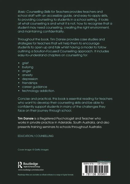 Basic Counselling Skills for Teachers provides teachers and school staff with an accessible guide, and easy-to-apply skills, to providing counselling to students in a school setting. It looks at what counselling is and what it is not, how to recognise that a student may need counselling, creating the right environment, and maintaining confidentiality. Throughout the book, Tim Dansie provides case studies and strategies for teachers that will help them to encourage students to open up and talk whilst having a model to follow outlining a Solution-Focused Counselling approach. It includes easy-to-understand chapters on counselling for: grief bullying anger anxiety depression friendships career guidance technology addiction. Concise and practical, this book is essential reading for teachers who want to develop their counselling skills and be able to confidently support students in many of the challenges they face on their journey through school.