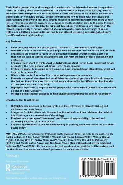 "Basic Ethics is an unusually rewarding text. It takes the student through central topics of normative ethics and metaethics, but it does so in a critical and constructive way that sheds new light on their basic issues. Boylan also adds helpful sections on applied ethics, as well as challenging and illuminating discussion of the importance of personal worldviews-both for moral philosophy and for human life as a whole. The book is written in a style that is at once engaging and rigorous."