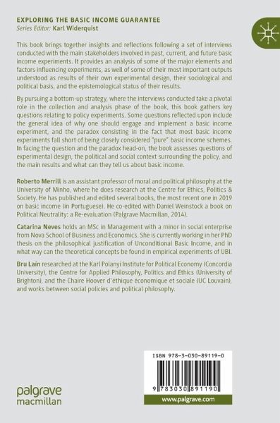 By pursuing a bottom-up strategy, where the interviews conducted take a pivotal role in the collection and analysis phase of the book, this book gathers key questions relating to policy experiments. Some questions reflected upon include the general idea of why one should engage and implement a basic income experiment, and the paradox consisting in the fact that most basic income experiments fall short of being closely considered "pure" basic income schemes. In facing the question and the paradox head-on,the book assesses questions of experimental design, the political and social context surrounding the policy, and the main results and what can they tell us about basic income.