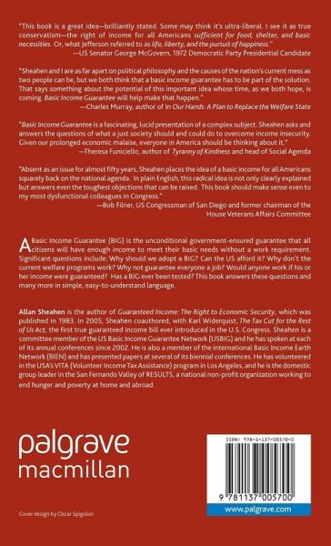 "Basic Income Guarantee is a fascinating, lucid presentation of a complex subject. Sheahen asks and answers the questionsof whata just society should and could do to overcome income insecurity. Given our prolonged economic malaise, everyone in America should be thinking about it." - Theresa Funiciello, author of Tyranny of Kindness and head of Social Agenda