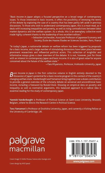 Foreword; Ronald Dore 1. Income Security and the 'Right to Subsistence' in Japan; Toru Yamamori and Yannick Vanderborght 2. A Comparative Look at the Feasibility of Basic Income in the Japanese Welfare State; Yannick Vanderborght and Yuki Sekine 3. Transforming Japan's Bismarckian Welfare State: Basic Income versus Inclusive Social Insurance; Takashi Suganuma 4. Is There a Future for a Universal Cash Benefit in Japan? The Case of Kodomo Teate (Child Benefit); Aya K. Abe 5. The 2011 Great East Japan Earthquake and Basic Income; Toru Yamamori 6. The Future of the Public Assistance Reform in Japan: Workfare versus Basic Income?; Hayato Kobayashi 7. Beyond the Three Selection Principles of Welfare Policy (Work, Family and Belonging): Towards a Reconsideration of the Fujin Hogo Jigyo (Women's Protection Project) in Japan; Kaori Katada 8. The Impact of Basic Income on the Gendered Division of Paid Care Work; Junko Yamashita 9. Basic Income and Unpaid Care Work in Japan; Sakura Furukubo 10. Beyond the Paradigm of Labor: Everyday Activism and Unconditional Basic Income in Urban Japan; Julia Obinger 11. The Tensions between Multiculturalism and Basic Income in Japan; Fumio Iida 12. What Do People Think about Basic Income in Japan?; Yoshio Itaba 13. What Needs to Be Considered When Introducing a New Welfare System: Who Supports Basic Income in Japan?; Rie Takamatsu and Toshiaki Tachibanaki 14. The Financial Feasibility of Basic Income and the Idea of a Refundable Tax Credit in Japan; Shinji Murakami 15. The Potential of Introducing Basic Income for the 'New Public' in Japan: A Road to Associational Welfare?; Hiroya Hirano