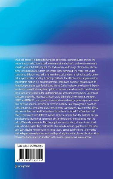 This book presents a detailed description of the basic physics of semiconductors. All the important equations describing the properties of these materials are derived without the help of other textbooks. The reader is assumed to have only a basic command of mathematics and some elementary semiconductor physics. The text covers a wide range of important semiconductor phenomena, from the simple to the advanced. Examples include recent progress in semiconductor quantum structures such as two-dimensional electron-gas systems, ballistic transport, the quantum Hall effect, the Landauer formula, the Coulomb blockade and the single-electron transistor.