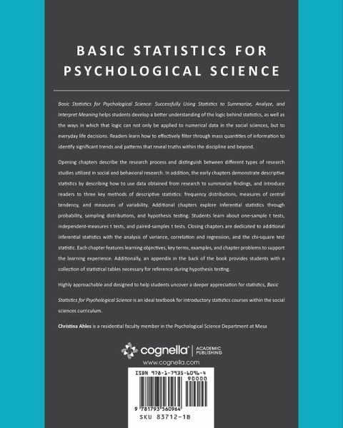 Basic Statistics for Psychological Science: Successfully Using Statistics to Summarize, Analyze, and Interpret Meaning helps students develop a better understanding of the logic behind statistics, as well as the ways in which that logic can not only be applied to numerical data in the social sciences, but to everyday life decisions. Readers learn how to effectively filter through mass quantities of information to identify significant trends and patterns that reveal truths within the discipline and beyond. Opening chapters describe the research process and distinguish between different types of research studies utilized in social and behavioral research. In addition, the early chapters demonstrate descriptive statistics by describing how to use data obtained from research to summarize findings, and introduce readers to three key methods of descriptive statistics: frequency distributions, measures of central tendency, and measures of variability. Additional chapters explore inferential statistics through probability, sampling distributions, and hypothesis testing. Students learn about one-sample t tests, independent-measures t tests, and paired-samples t tests. Closing chapters are dedicated to additional inferential statistics with the analysis of variance, correlation and regression, and the chi-square test statistic. Each chapter features learning objectives, key terms, examples, and chapter problems to support the learning experience. Additionally, an appendix in the back of the book provides students with a collection of statistical tables necessary for reference during hypothesis testing. Highly approachable and designed to help students uncover a deeper appreciation for statistics, Basic Statistics for Psychological Science is an ideal textbook for introductory statistics courses within the social sciences curriculum.