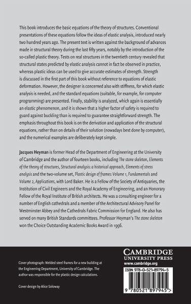 This text introduces the basic equations of the theory of structures. Conventional presentations of these equations follow the ideas of elastic analysis, introduced nearly two hundred years ago. The book is written against the background of advances made in structural theory during the last fifty years, notably by the introduction of so-called plastic theory. The emphasis throughout is on the derivation and application of the structural equations, rather than on details of their solution (nowadays best done by computer), and the numerical examples are deliberately kept simple.