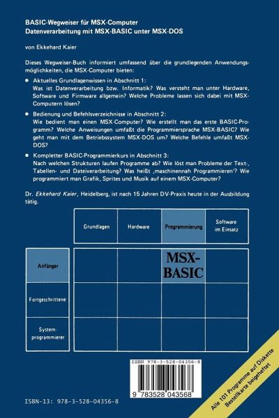 Das vorliegende Wegweiser-Buch weist Wege zum erfolgreichen Einsatz von MSX-Computern. Das Wegweiser-Buch vermittelt aktuelles Grundlagenwissen zur Datenver arbeitung bzw. Informatik: - Was ist Hardware, Software und Firmware? - Was sind GroBcomputer und Mikrocomputer? - Was sind Datenstrukturen und Programmstrukturen? - Was sind Betriebssysteme und Anwenderprogramme? - Was heiBt ,fertige Programm-Pakete einsetzen'? - Was beinhaltet das eigene Programmieren? Nach der Lekture dieses Abschnitts sind Sie in der Lage, die MSX-Computer in den Gesamtrahmen der "Datenverarbeitung/ Informatik" einzuordnen. Das Wegweiser-Buch gibt eine erste Bedienungsanleitung: - Wie bedient man Tastatur, Bildschirm, Floppy bzw. Disketteneinheit und Drucker des MSX-Computers? - Wie erstellt man das erste Programm in der Programmiersprache MSX-BASIC? - Welche Befehle umfaBt MSX-BASIC (zu jedem Befehl wird ein Beispiel a ngegeben) ? - Worin unterscheiden sich das Arbeiten in der BASIC-Ebene vom Arbeiten inder Betriebssystem-Ebene unter MSX-DOS? - Welche Befehle umfaBt MSX-DOS (zu jedem Befehl wird ein Beispiel angegeben)? Nach der Lekture dieses Abschnitts konnen Sie Ihren MSX-Computer be dienen, Programme laufen lassen und einfache BASIC-Programme selbst erstellen und speichern. Das Wegweiser-Buch enthalt einen kompletten Programmierkurs mit folgen den grundlegenden BASIC-Anwendungen: - Programme mit den wichtigen Ablaufstrukturen (Foige-, Auswahl-, Wiederholungs-und Unterprogrammstrukturen) - Verarbeitung von Text, Ein-/Ausgabe und Tabellen - Maschinennahe Programmierung ( ... Bit fur Bit) - Suchen, Sortieren, Mischen und Gruppieren von Daten - Sequentielle Datei und Direktzugriff-Datei - Grafik, Sprites und Musik.