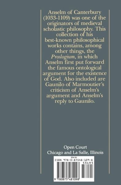 Anselm of Canterbury (1033-1109) was one of the originators of medievil scholastic philosophy. This collection of his best-known philosophical works contains, among other things, the Proslogium, in which Anselm first put forward the famous ontological argument for the existence of God. Also included are Gaunilo of Maurmoutier's criticism of Anselm's argument and Anselm's reply to Gaunilo.