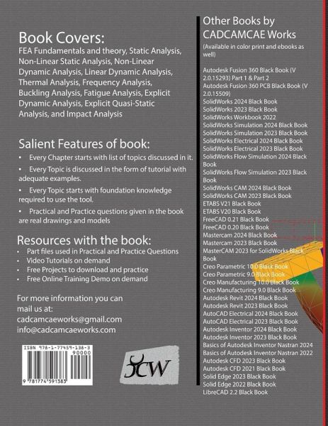 The Basics of Autodesk Inventor Nastran 2025 is the new and updated 5th edition of our book on Autodesk Inventor Nastran. This book helps professionals as well as students in learning basics of Finite Element Analysis via Autodesk Inventor Nastran. The book follows a step-by-step methodology. This book explains the background work running behind your simulation analysis screen. The book starts with introduction to simulation and goes through all the analysis tools of Autodesk Inventor Nastran with practical examples of analysis. Chapter on manual FEA ensure the firm understanding of FEA concepts. Some of the salient features of this book are: In-Depth explanation of concepts Every new topic of this book starts with the explanation of basic concepts. In this way, the user becomes capable of relating the things with real world. Topics Covered Every chapter starts with a list of topics being covered in that chapter. In this way, the user can easy find the topic of his/her interest easily. Instruction through illustration The instructions to perform any action are provided by maximum number of illustrations so that the user can perform the actions discussed in the book easily and effectively. There are about 410 illustrations that make the learning process effective. Tutorial point of view The book explains the concepts through the tutorial to make the understanding of users firm and long lasting. Each chapter of the book has tutorials that are real world projects. Project Projects and exercises are provided to students for asking for more practice. For Faculty If you are a faculty member, then you can ask for video tutorials on any of the topic, exercise, tutorial, or concept. As faculty, you can register on our website to get electronic desk copies of our latest books, self-assessment, and solution of practical. Faculty resources are available in the Faculty Member page of our website once you login. Note that faculty registration approval is manual and it may take two days for approval before you can access the faculty website.