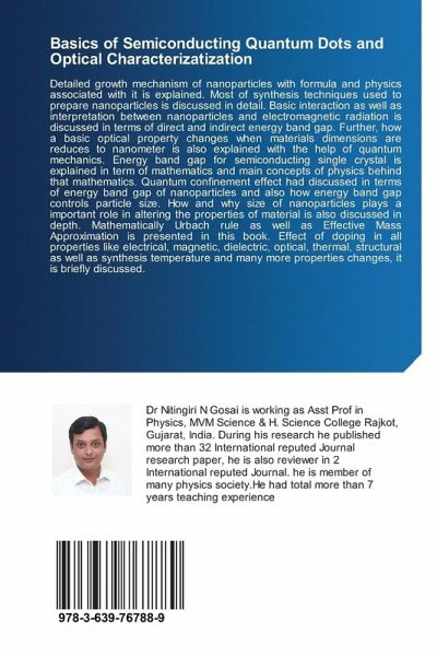 Detailed growth mechanism of nanoparticles with formula and physics associated with it is explained. Most of synthesis techniques used to prepare nanoparticles is discussed in detail. Basic interaction as well as interpretation between nanoparticles and electromagnetic radiation is discussed in terms of direct and indirect energy band gap. Further, how a basic optical property changes when materials dimensions are reduces to nanometer is also explained with the help of quantum mechanics. Energy band gap for semiconducting single crystal is explained in term of mathematics and main concepts of physics behind that mathematics. Quantum confinement effect had discussed in terms of energy band gap of nanoparticles and also how energy band gap controls particle size. How and why size of nanoparticles plays a important role in altering the properties of material is also discussed in depth. Mathematically Urbach rule as well as Effective Mass Approximation is presented in this book. Effect of doping in all properties like electrical, magnetic, dielectric, optical, thermal, structural as well as synthesis temperature and many more properties changes, it is briefly discussed.