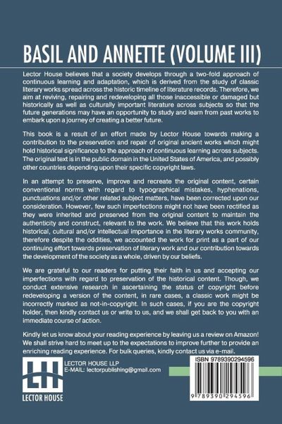 Basil And Annette (Volume III): A Novel. In Three Volumes - Vol. III. This book is a result of an effort made by us towards making a contribution to the preservation and repair of original classic literature. In an attempt to preserve, improve and recreate the original content, we have worked towards: 1. Type-setting & Reformatting: The complete work has been re-designed via professional layout, formatting and type-setting tools to re-create the same edition with rich typography, graphics, high quality images, and table elements, giving our readers the feel of holding a 'fresh and newly' reprinted and/or revised edition, as opposed to other scanned & printed (Optical Character Recognition - OCR) reproductions. 2. Correction of imperfections: As the work was re-created from the scratch, therefore, it was vetted to rectify certain conventional norms with regard to typographical mistakes, hyphenations, punctuations, blurred images, missing content/pages, and/or other related subject matters, upon our consideration. Every attempt was made to rectify the imperfections related to omitted constructs in the original edition via other references. However, a few of such imperfections which could not be rectified due to intentional\unintentional omission of content in the original edition, were inherited and preserved from the original work to maintain the authenticity and construct, relevant to the work. We believe that this work holds historical, cultural and/or intellectual importance in the literary works community, therefore despite the oddities, we accounted the work for print as a part of our continuing effort towards preservation of literary work and our contribution towards the development of the society as a whole, driven by our beliefs. We are grateful to our readers for putting their faith in us and accepting our imperfections with regard to preservation of the historical content. HAPPY READING!